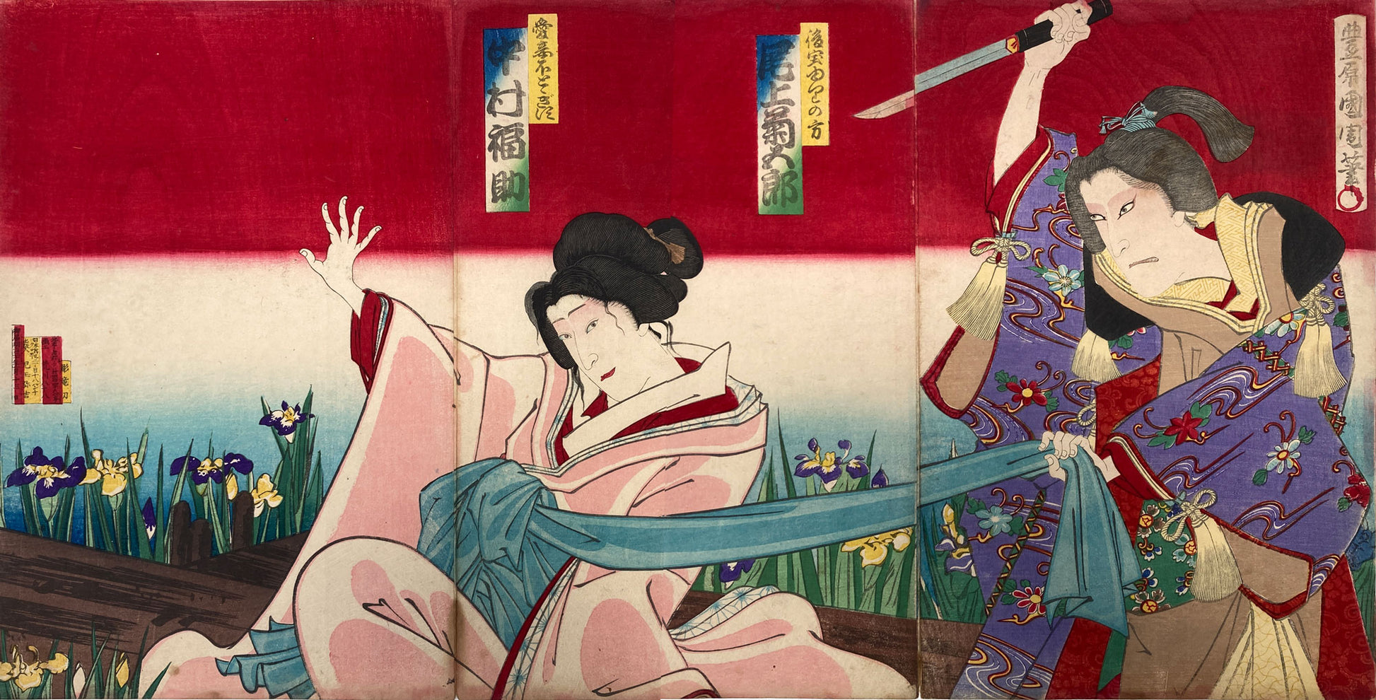 A brilliant design by Kunichika of the opening act of the great revenge tragedy - "Plum Blossoms and the Heroes of the Palace". Cast: Concubine Hototogisu, Nakamura Utaemon, Onoe Kikugorou V.