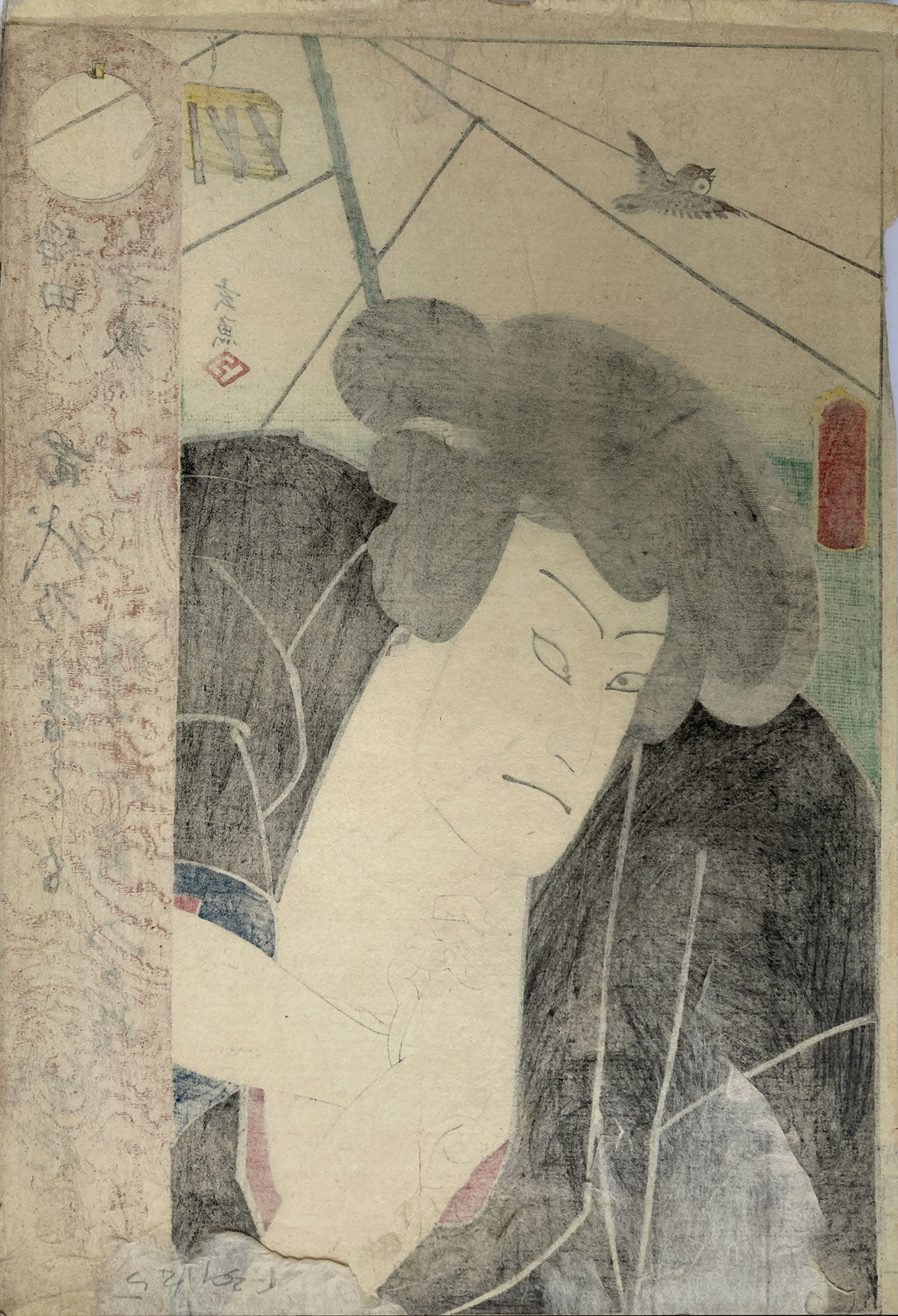 The actor: Nakamura Shikan IV in the role of: Inada Kozō (稲田幸蔵) in the play: Kutsuwa no oto tazuna no Somewake. From a series of half-length actor portraits with poem. The still-lifes in the top of the prints were designed by Gengyo Miyagi (in most cases).