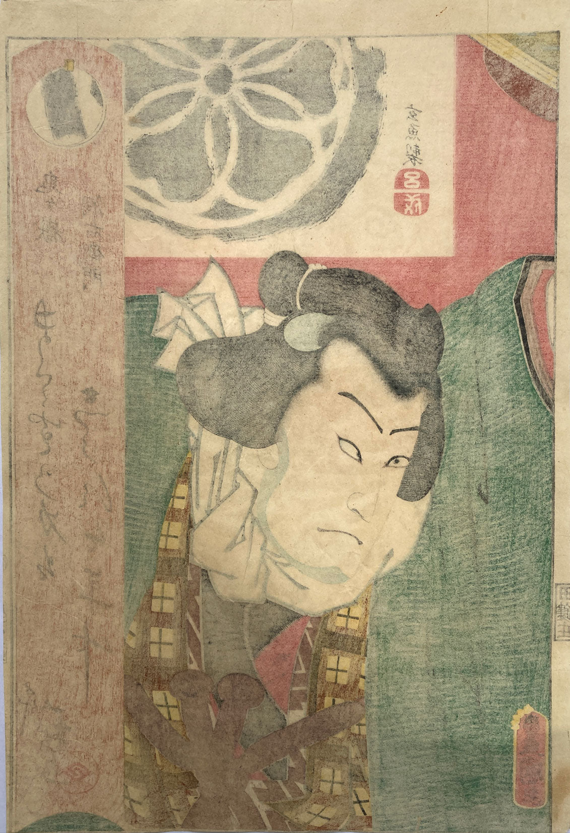 The kabuki actor: Bandō Hikosaburō V in the role of Onigatake Horaemon (鬼ヶ嶽洞右衛門). From the play: Sekitori Nidai no shobu zuke. From a series of half-length actor portraits with poem. The still-lifes in the top of the prints were designed by Gengyo Miyagi (in most cases).