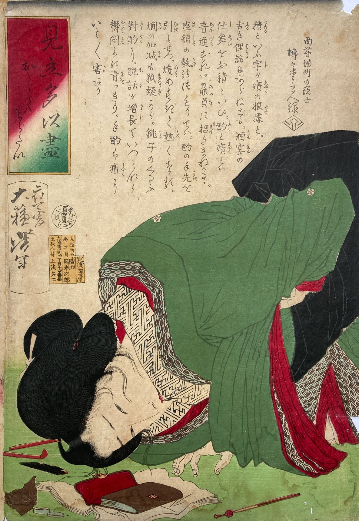 This print is by Yoshitoshi from his 1877 series A Collection of Desires. It consists of images of beautiful women who are wishing for something. In this case the title is "I want to be massaged". We have this woman leaning over wishing she could have a massage. It dates from the middle Yoshitoshi's career, when he was about thirty-eight. I know this print is from the first edition because of the red white and green shading in this title cartouche - the later editions were gray. It looks like she’s emptied all of her personal stuff from her kimono and she’s waiting for that massage.