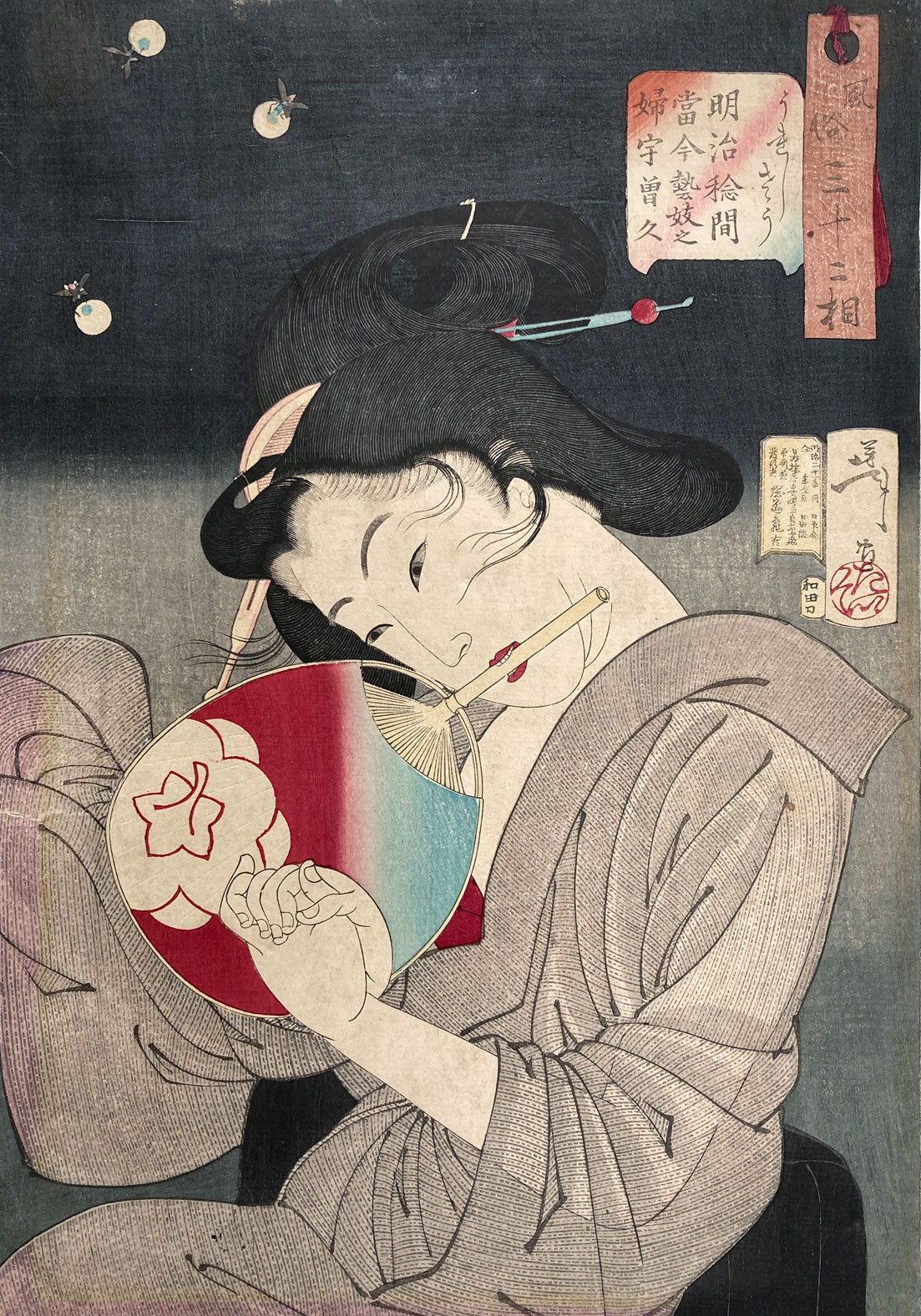 First edition print titled: "Happy Expression", a modern geisha in the Meiji period. The young geisha has just caught a firefly, and is not quite sure what to do with her catch. From the popular series "Thirty-two Aspects of Customs and Manners" considered Yoshitoshi's finest series of bijin-ga, or pictures of beautiful women. The women depicted come from all social classes.