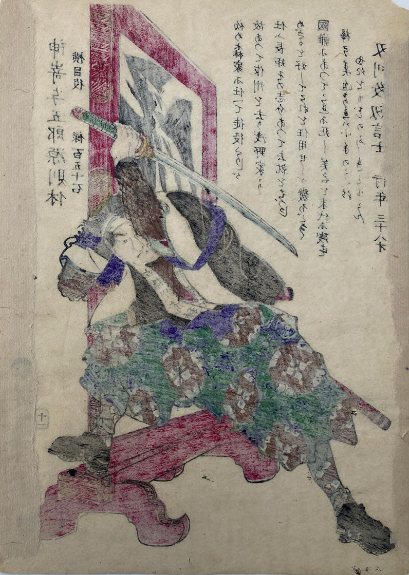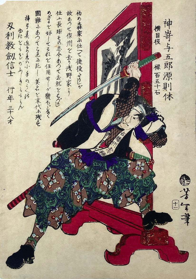 The ronin, Kanzaki Yogorō Minamoto no Noriyasu. This print depicts one of the legendary 47 rōnin, part of the series Historical Biographies of the Loyal Retainers by Tsukioka Yoshitoshi. Published in 1869, the series features individual portraits of each of the rōnin, complete with biographical details that bring these real-life samurai to life. Their story—an epic tale of loyalty, honor, and revenge—was a true historical event that captured the imagination of generations.