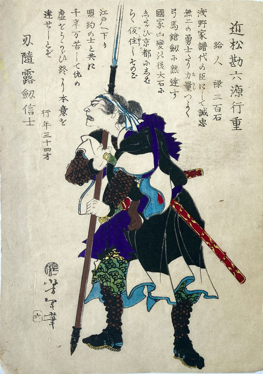 The ronin, Chikamatsu Kanroku. Yukishige's family were retainers of the Asano family for generations. His mother encouraged him to take part in the raid. Later that night, she killed herself. This print depicts one of the legendary 47 rōnin, part of the series Historical Biographies of the Loyal Retainers by Tsukioka Yoshitoshi. Published in 1869, the series features individual portraits of each of the rōnin, complete with biographical details that bring these real-life samurai to life. Their story—an epic tale of loyalty, honor, and revenge—was a true historical event that captured the imagination of generations.