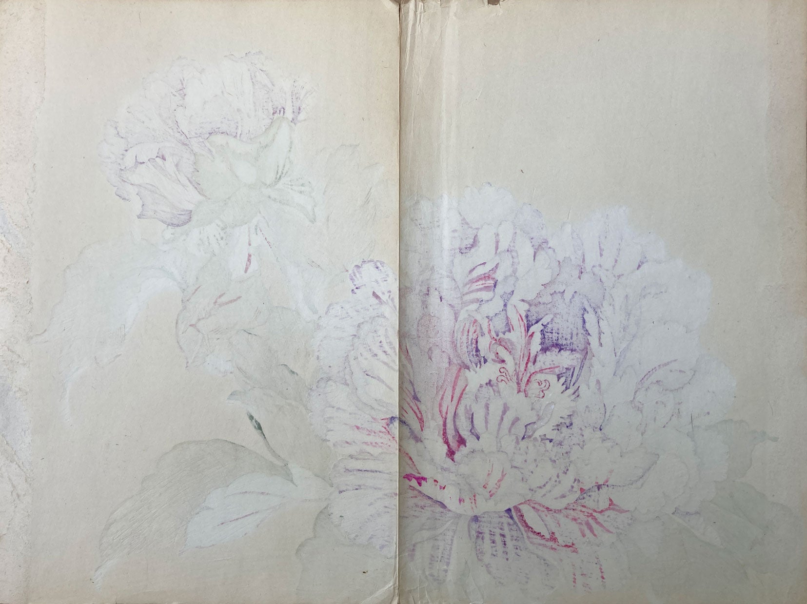 Gorgeous print from the most spectacular flower book of the Taisho era. The double pages depict peonies in all their splendor of color and variety. Tanigami Konan, one of Japan's famous naturalist artists, was chosen to produce a series of peony paintings for the Teiten (Imperial Academy Art Exhibition). In 1923, Unsodo published a woodblock print set "Shôkei-Kaki-chô" (Selected Flower Pictures) of 24 peonies based on the original paintings.