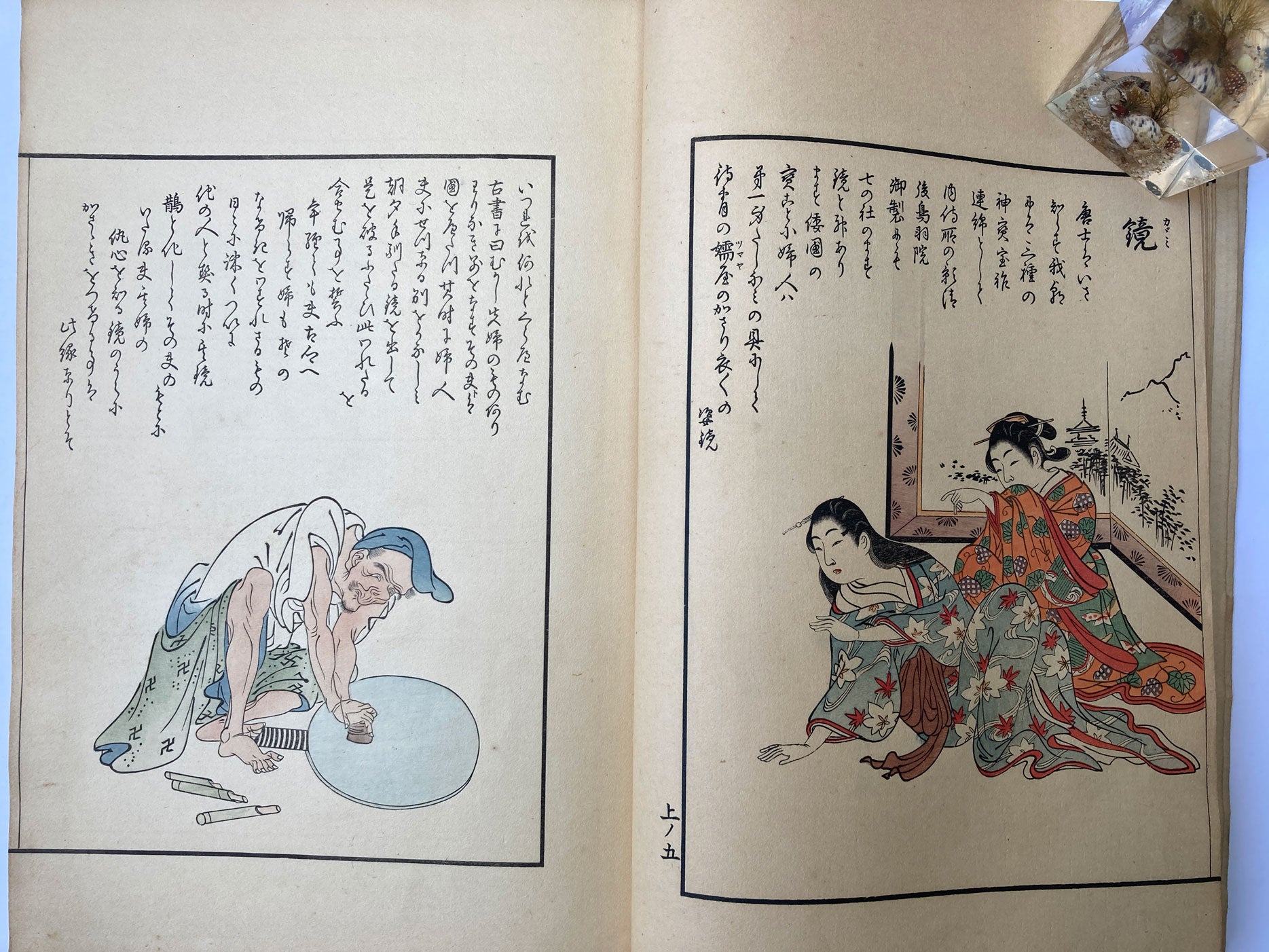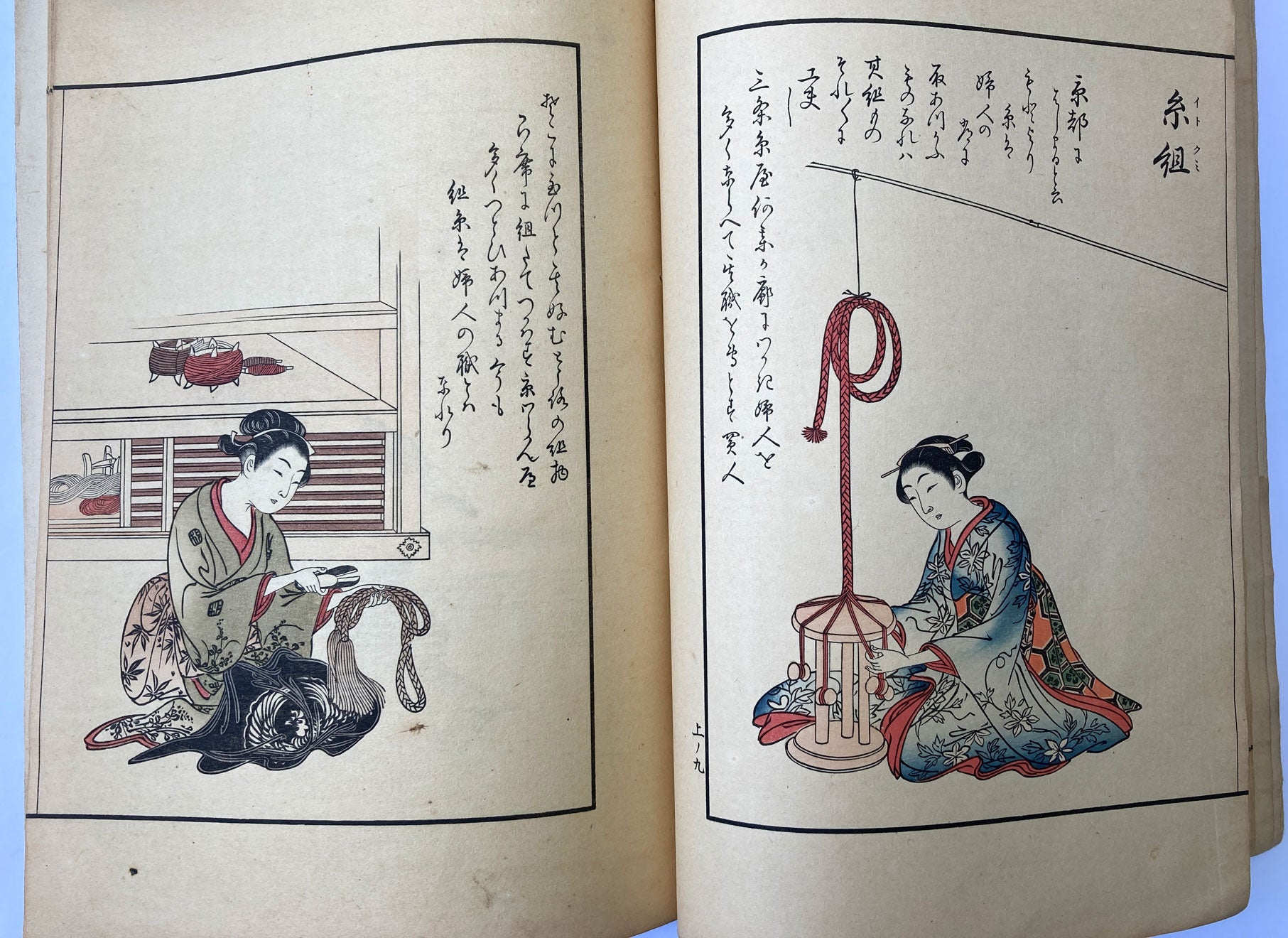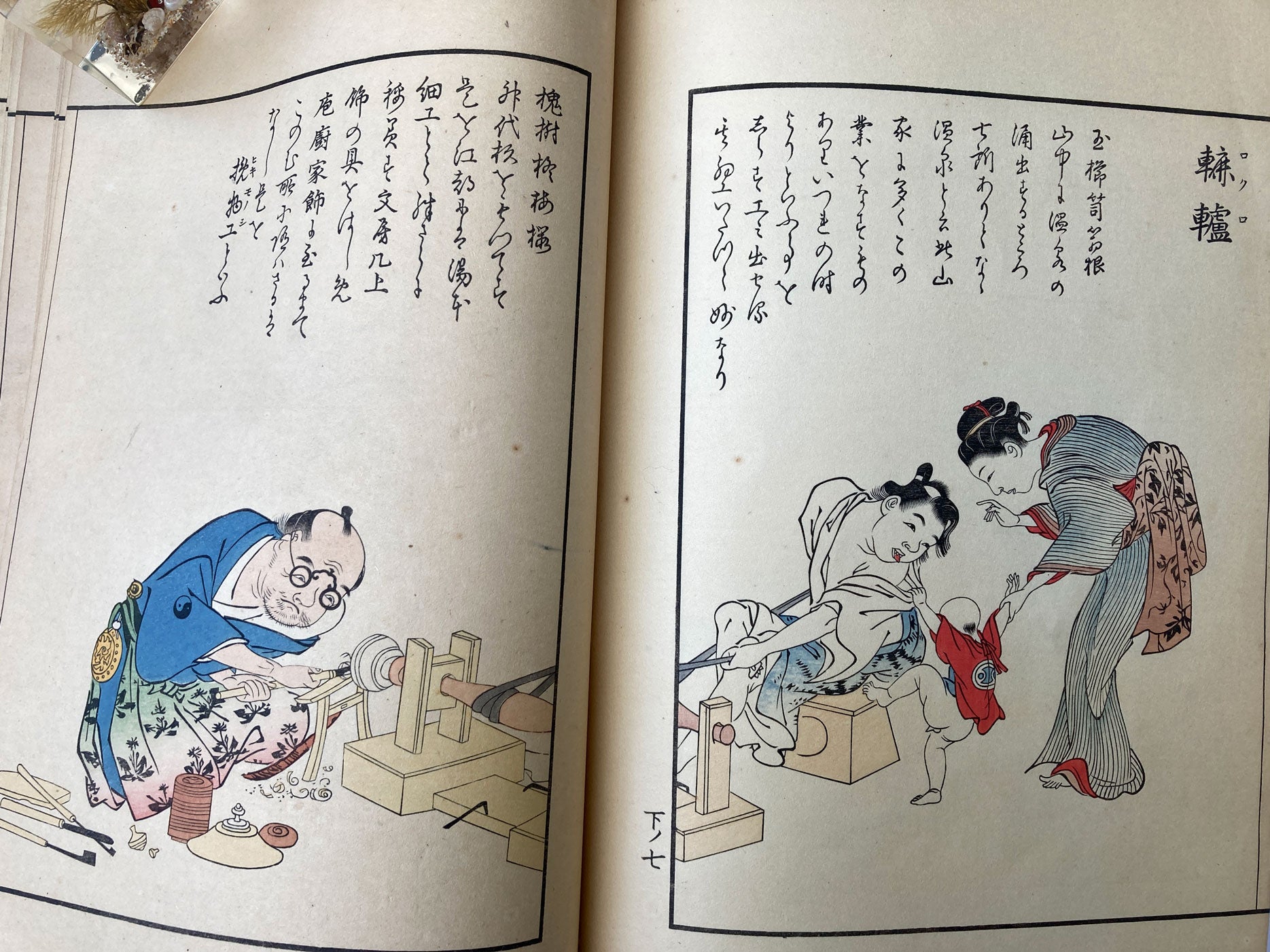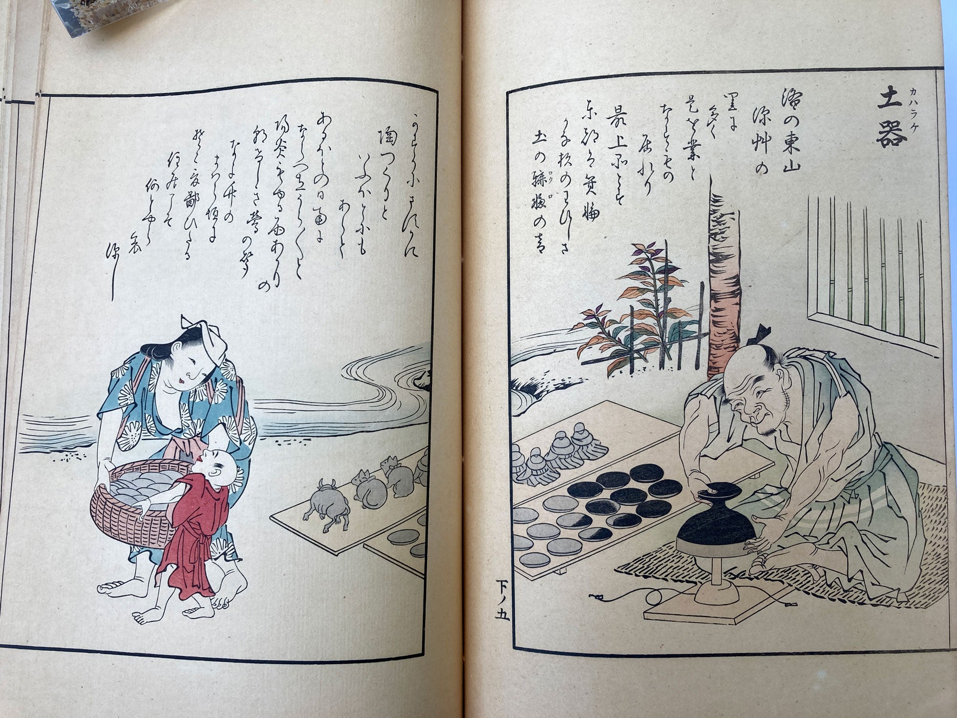 A set of two books - SAIGA SHOKUNIN BURUI Japanese Workers Tradesmen. This is a reprint of the original 18th century series. Books show various tradespeople going about their daily work. Covers are worn but pages are in very good condition.