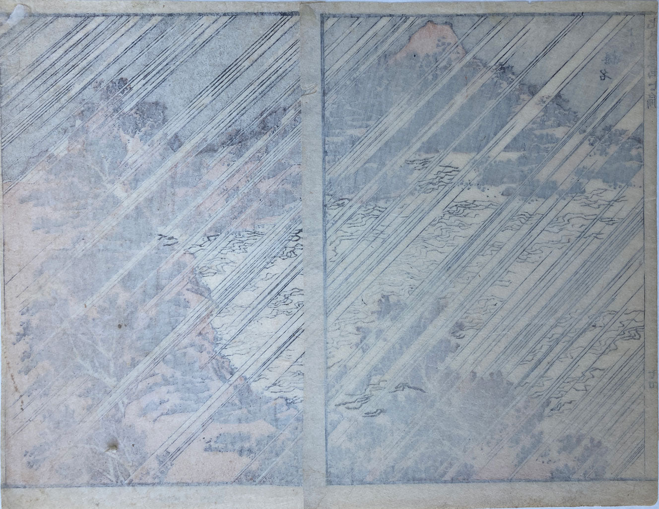 A two-page spread of a lanscape in a violent storm, from Hokusai’s manga, vol.7 (伝神開手)北斎漫画, 七編. From an original series of fifteen volumes. Each volume contained 33 folded sheets (cho) with illustrations in three colors (black sumi, light black sumi, and light vermilion) and text. Representations of people, plants and animals, fish, birds, mythological figures, landscapes, etc.