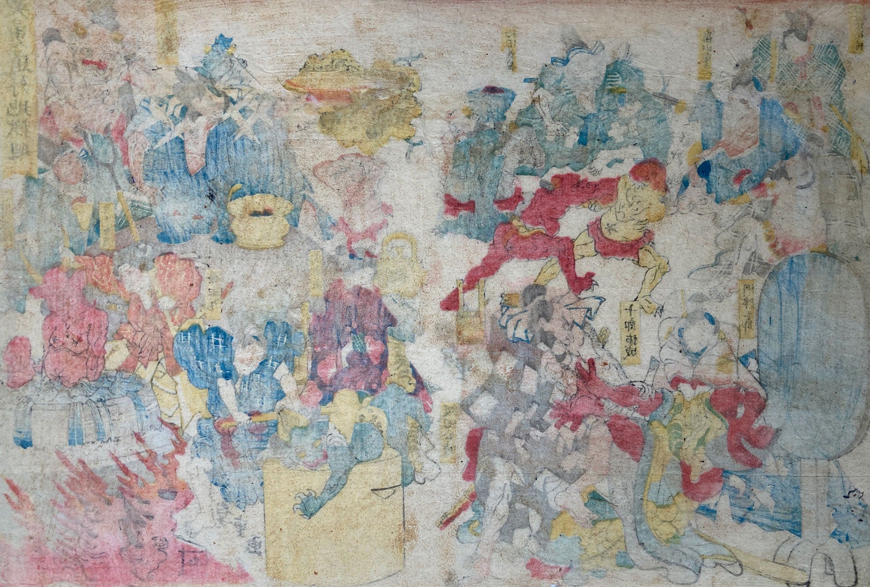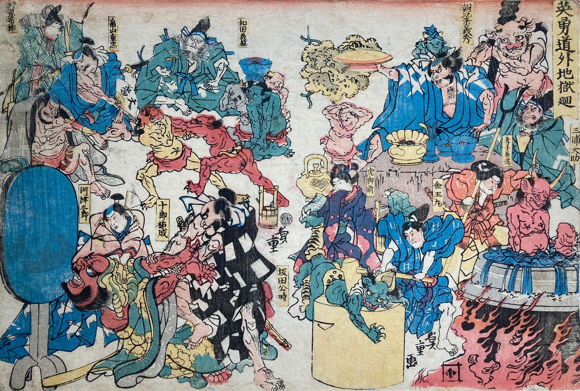 An interesting and humorous print by the artist Kuniteru 歌川国輝 (Sadashige 貞重). The title is "Heroes Clowning Around on a Tour of Hell". We see popular heroes tormenting the denizens of hell. He studied under both Kunisada and Toyokuni. He produced prints on a wide variety of subjects, including many depicting the increasing Western influence on Japan, with his main output taking the form of book illustrations and single-sheet ukiyo-e.