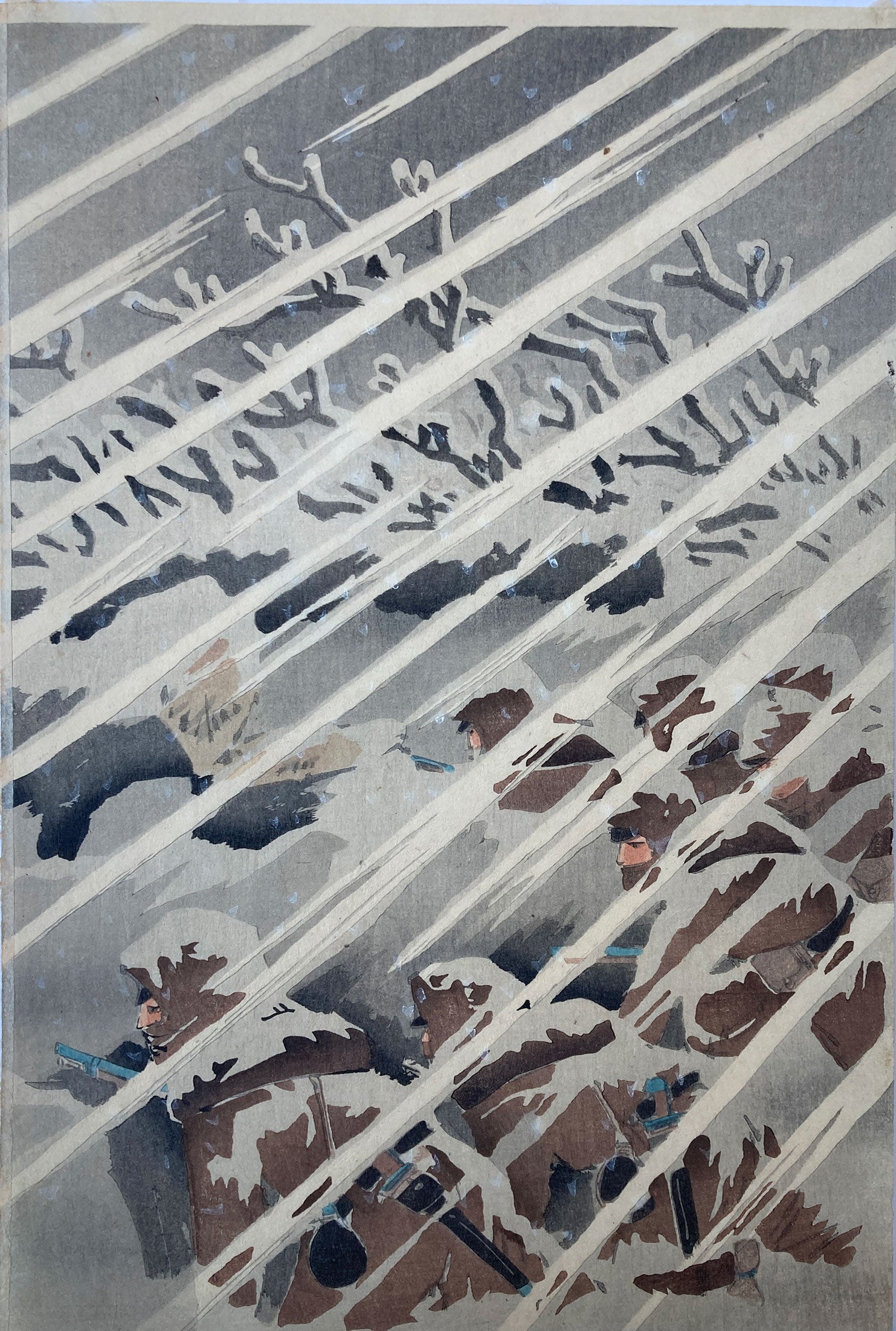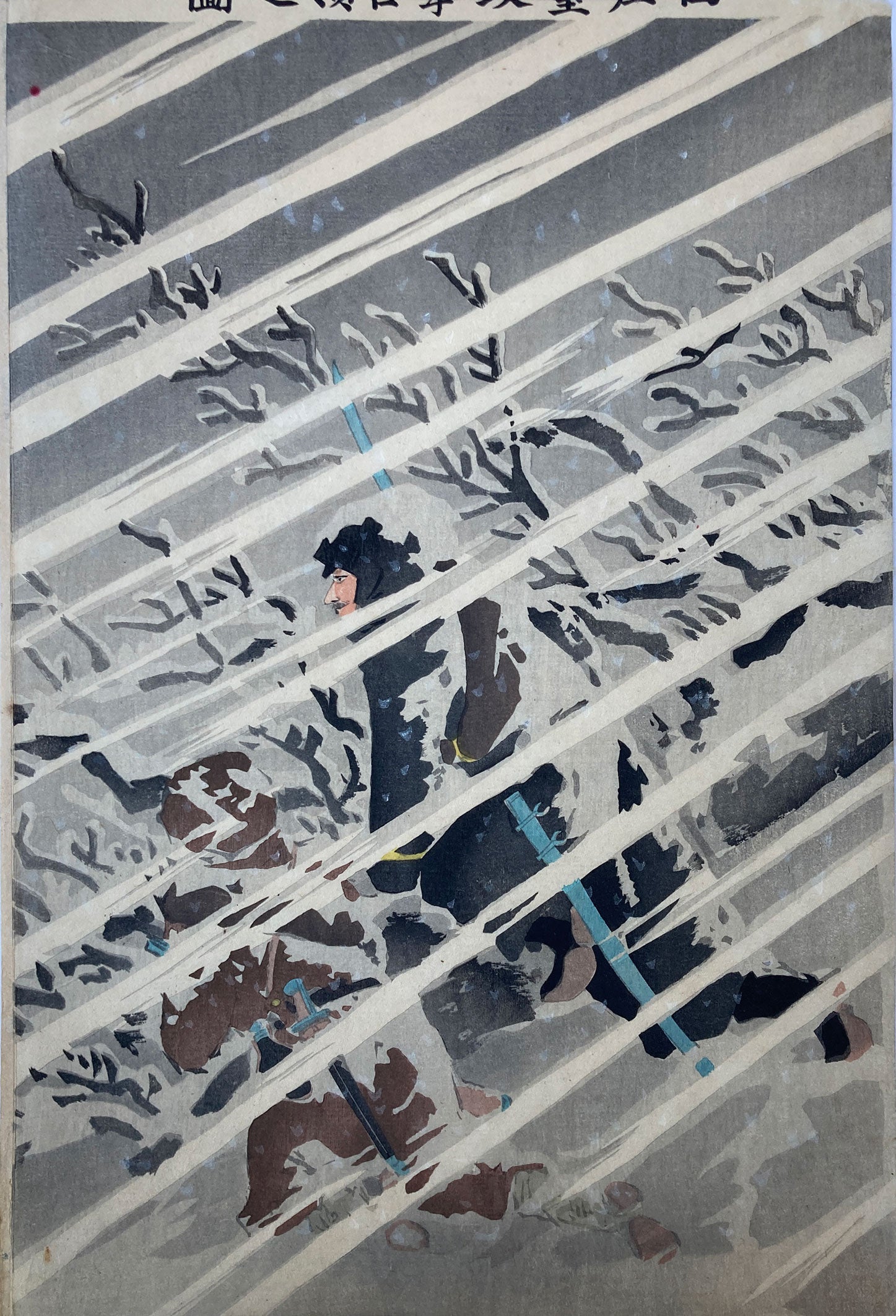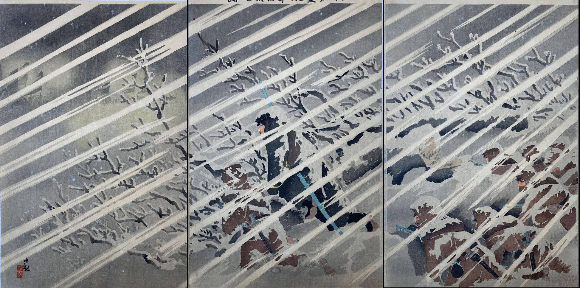 Triptych of an evocative battle scene titled “Attack and Occupation of Tianzhuangtai". From the series: The First Sino and Japanese war. Japanese soldiers advance in the dead of winter. The Chinese soldiers can be seen in the distance. Kiyochika shows his ability to use realistic light and shading, foreshadowing his later work.