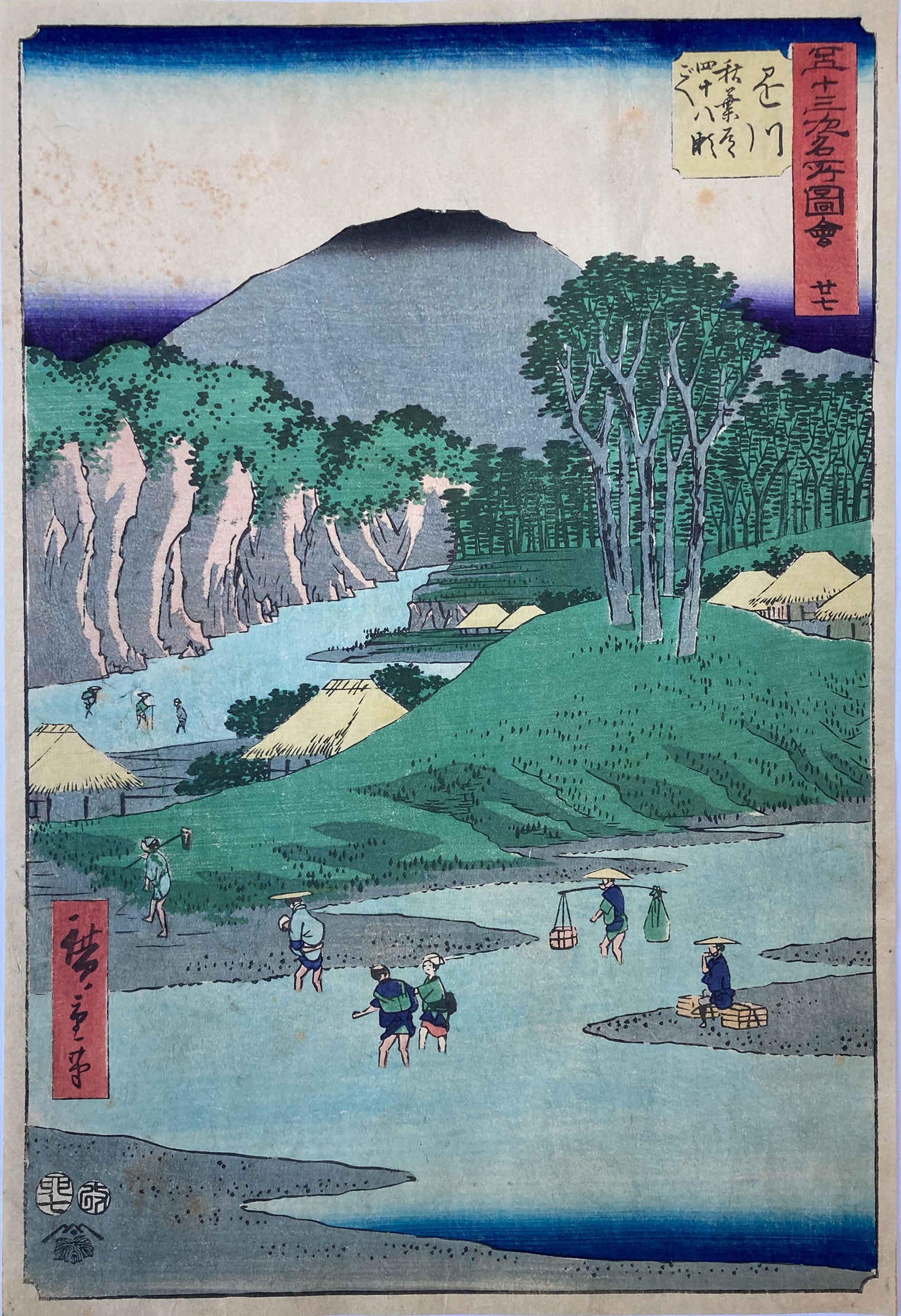 Kakegawa: Forging the Forty-eight Rapids on the Akiba Road (Kanagawa, Akiba michi shijuhachi segoe). The scene depicts travelers crossing the river. There was a fixed fee to be carried across on porter’s backs, but it was not uncommon for the porter to stop in the middle of the river and demand more money.