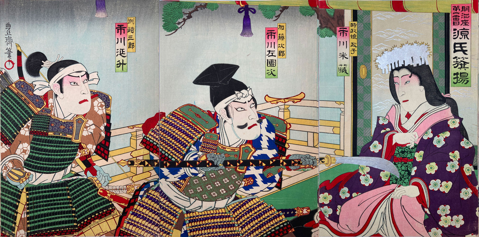 Armed and Dangerous - Samurai warriors, Suzaki Saburo (left: played by Ichikawa Ensho) and Kato Jiro (Ichikawa Sadanji) burst into the palace of Hojo Tokimasa and threaten his daughter, Masako in the play, "Genji Hata-age" performed in the Meiji-za theater.