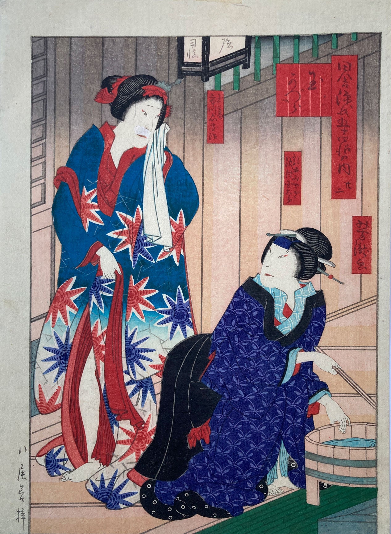 An Osaka print called "Tanago Genji's Fifty-Four Posts". This is number 22 in the series. Kabuki actors are Sawura Kunitaro and Ichikawa Ueji.