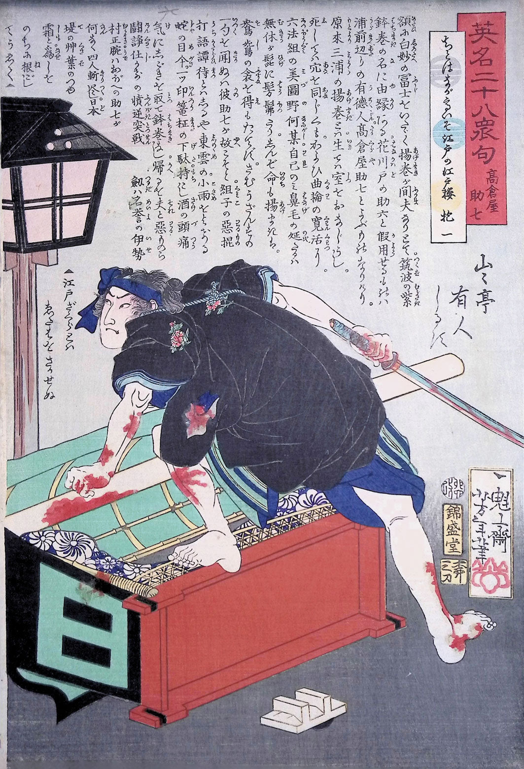Takekura Sukekichi and overturned palanquin. #11 in the series: 'Eimei nijūhasshūku (英名 二十八 衆句 - 28 Famous Murders with Verse)', of which Yoshitoshi produced half, with Yoshiiku being responsible for the others. It dates from early in Yoshitoshi's career, when he was about twenty-seven. The series contains illustrations of events which often have a historical background, and were usually well-known from kabuki and noh plays.
