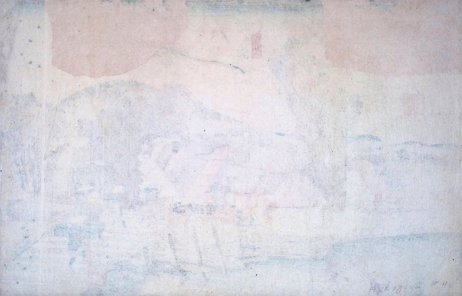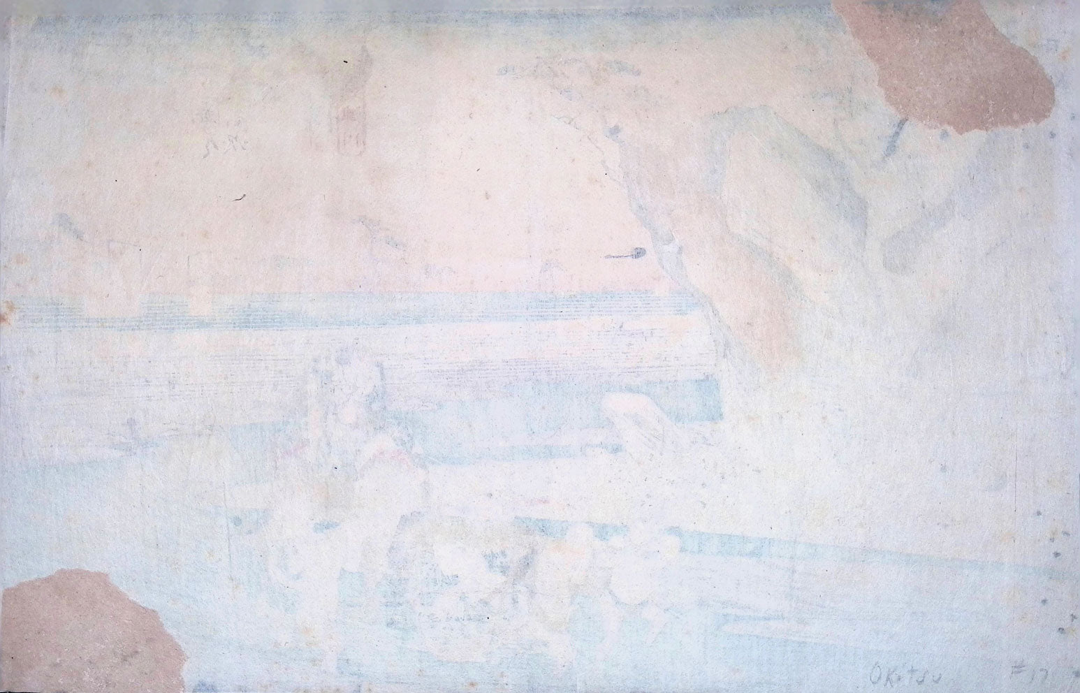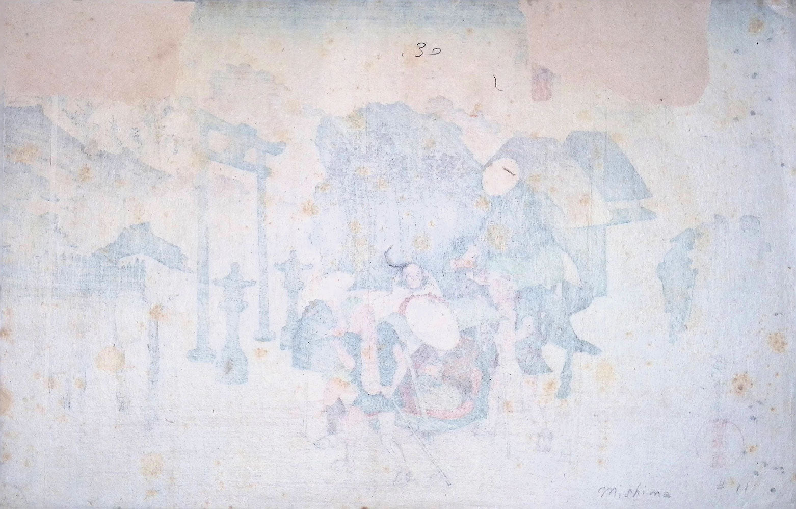 Hiroshige's "Great Tokaido" also known as the "Hoeido Tokaido" (after the publisher) was the print series that launched Hiroshige's career. These prints are from the Hoeido Tokaido but as you can see they are in quite poor condition. We are selling these in groups of prints at a low price to collectors that want to own an original Tokaido print but can't spend the thousands of dollars it sometimes costs.