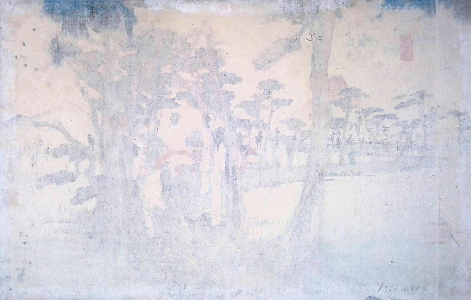 This print is from the Hoeido Tokaido but as you can see it is in poor condition. We are selling this print at a low price to collectors that want to own an original Tokaido print but can't spend the thousands of dollars it sometimes costs.